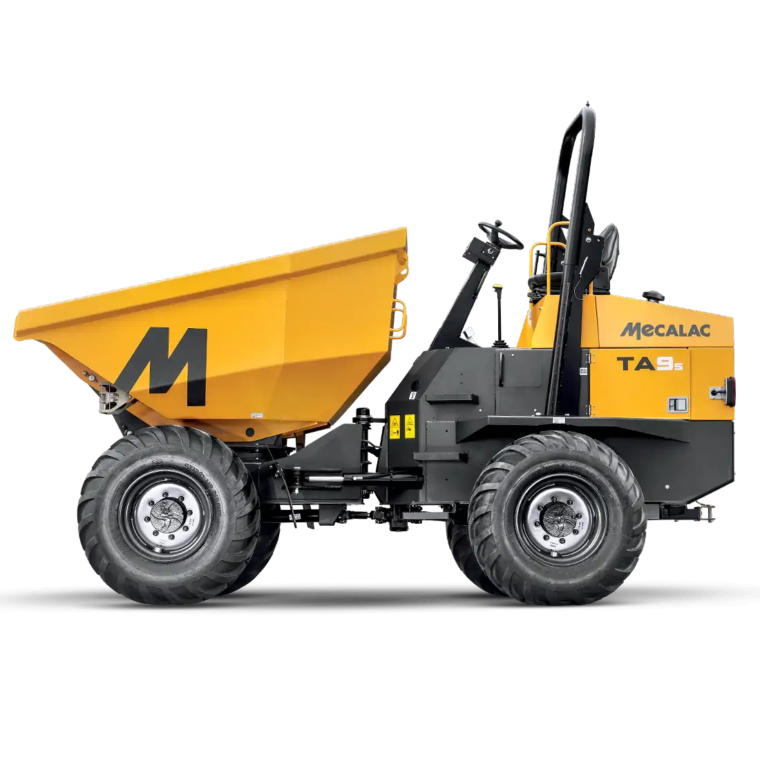 El dumper de obra Mecalac TA9 fue concebido para obras de gran tamaño, imponiéndose como el amo de la versatilidad. Con una carga útil de 9000 kg están disponibles tanto una caja de volquete frontal como una caja de volquete con giro de 180°